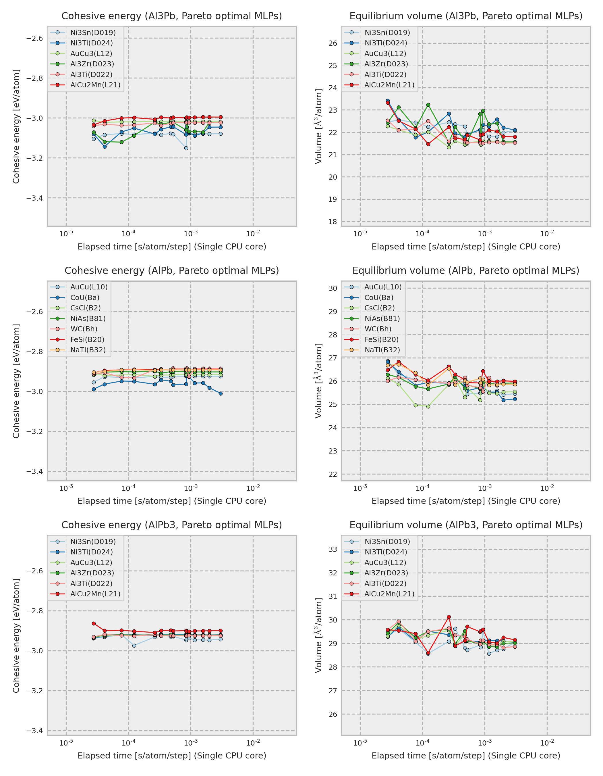 The cohesive energy and volume are obtained by performing a local structure optimization from the DFT equilibrium structure. In addition, the DFT equilibrium structure is obtained by optimizing a prototype structure included in ICSD, and the prototype is used as the structure legend in the figure. Therefore, the structure type of the converged structure is sometimes different from that shown in the legend even if the potential energy surface predicted by MLP is almost the same as the true one.