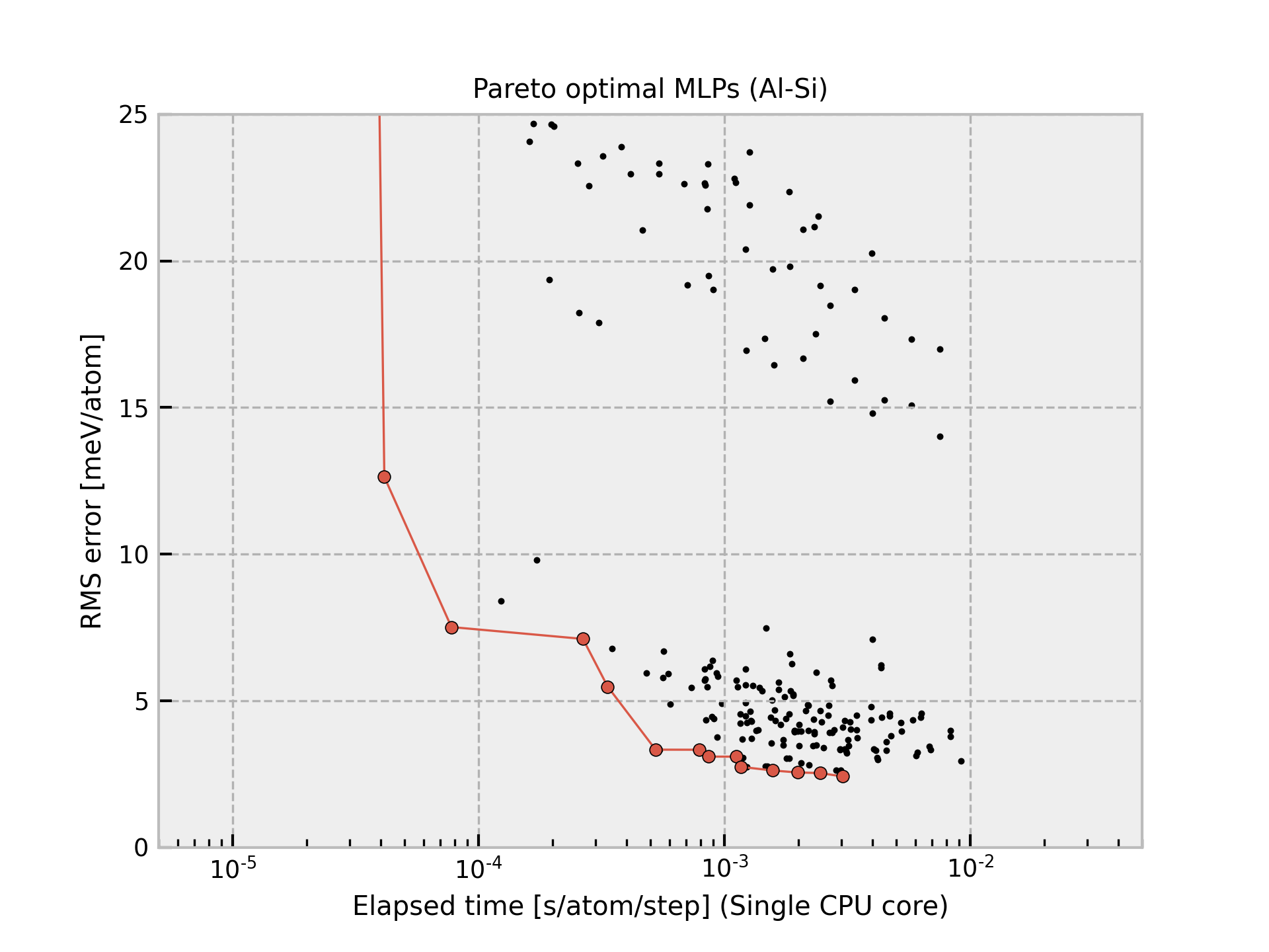 Column “Time” shows the time required to compute the energy and forces for 1 MD step and 1 atom, which is estimated from a simulation of 10 runs for a structure with 284 atoms using a workstation with Intel(R) Xeon(R) CPU E5-2695 v4 @ 2.10GHz. Note that the MLPs should be carefully used for extreme structures. The MLPs often return meaningless values for them.