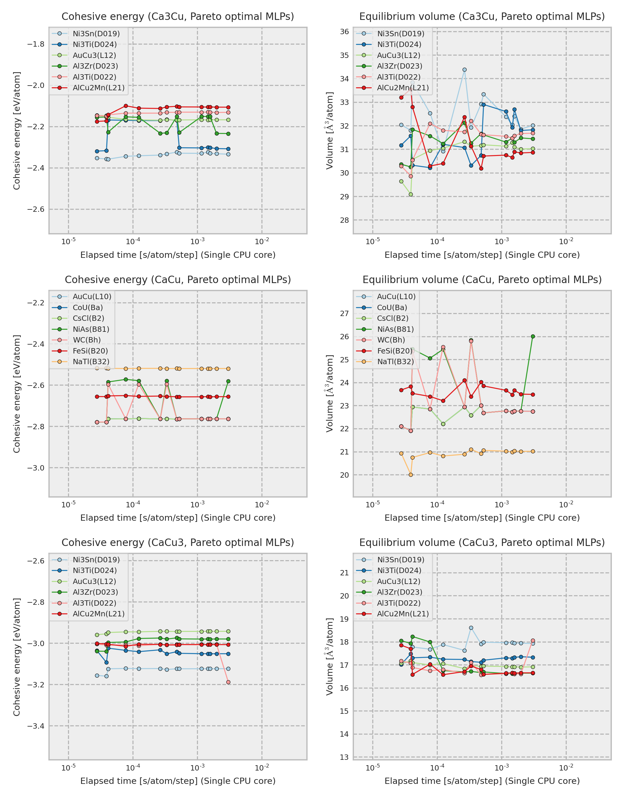 The cohesive energy and volume are obtained by performing a local structure optimization from the DFT equilibrium structure. In addition, the DFT equilibrium structure is obtained by optimizing a prototype structure included in ICSD, and the prototype is used as the structure legend in the figure. Therefore, the structure type of the converged structure is sometimes different from that shown in the legend even if the potential energy surface predicted by MLP is almost the same as the true one.