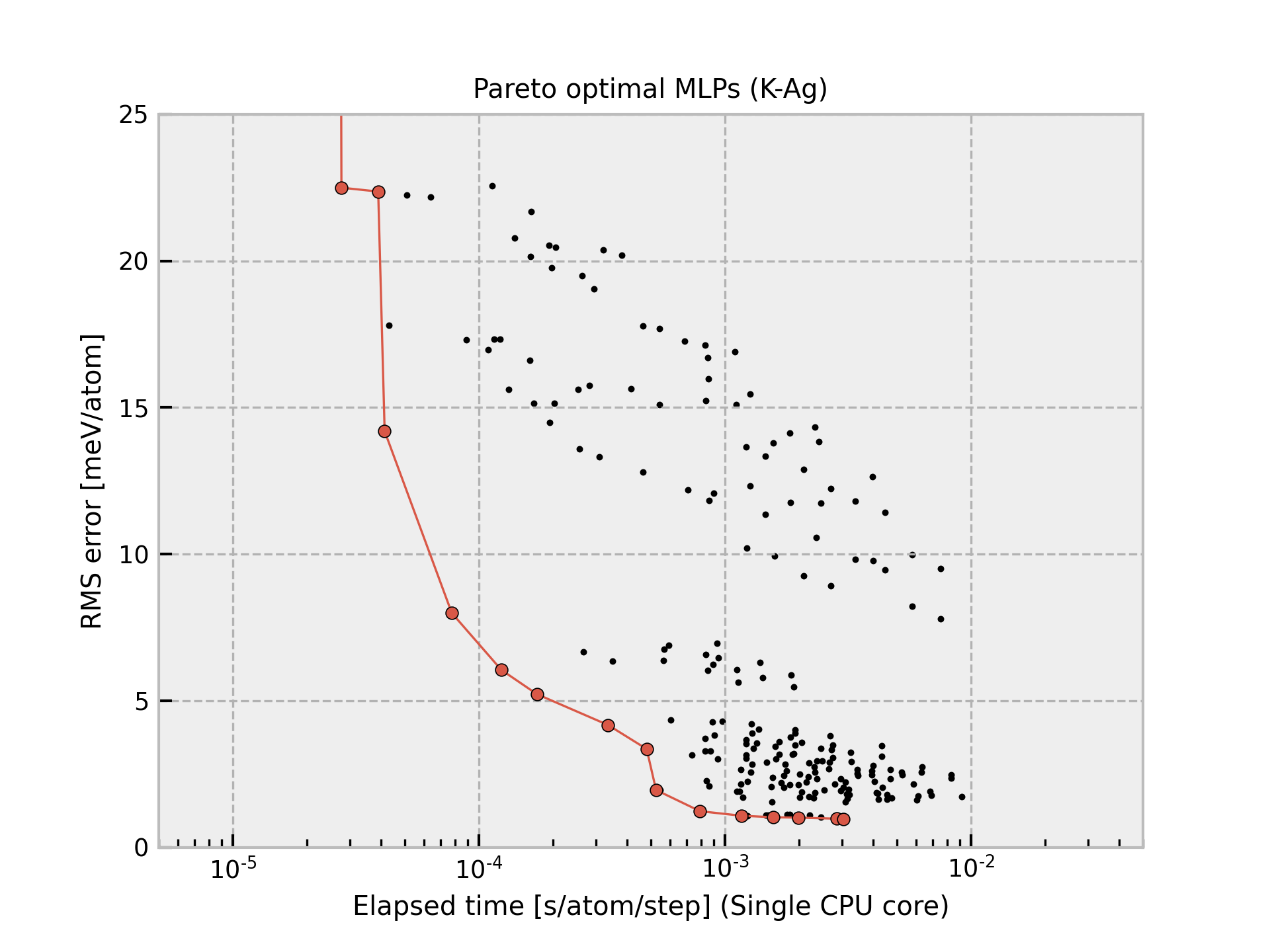 Column “Time” shows the time required to compute the energy and forces for 1 MD step and 1 atom, which is estimated from a simulation of 10 runs for a structure with 284 atoms using a workstation with Intel(R) Xeon(R) CPU E5-2695 v4 @ 2.10GHz. Note that the MLPs should be carefully used for extreme structures. The MLPs often return meaningless values for them.