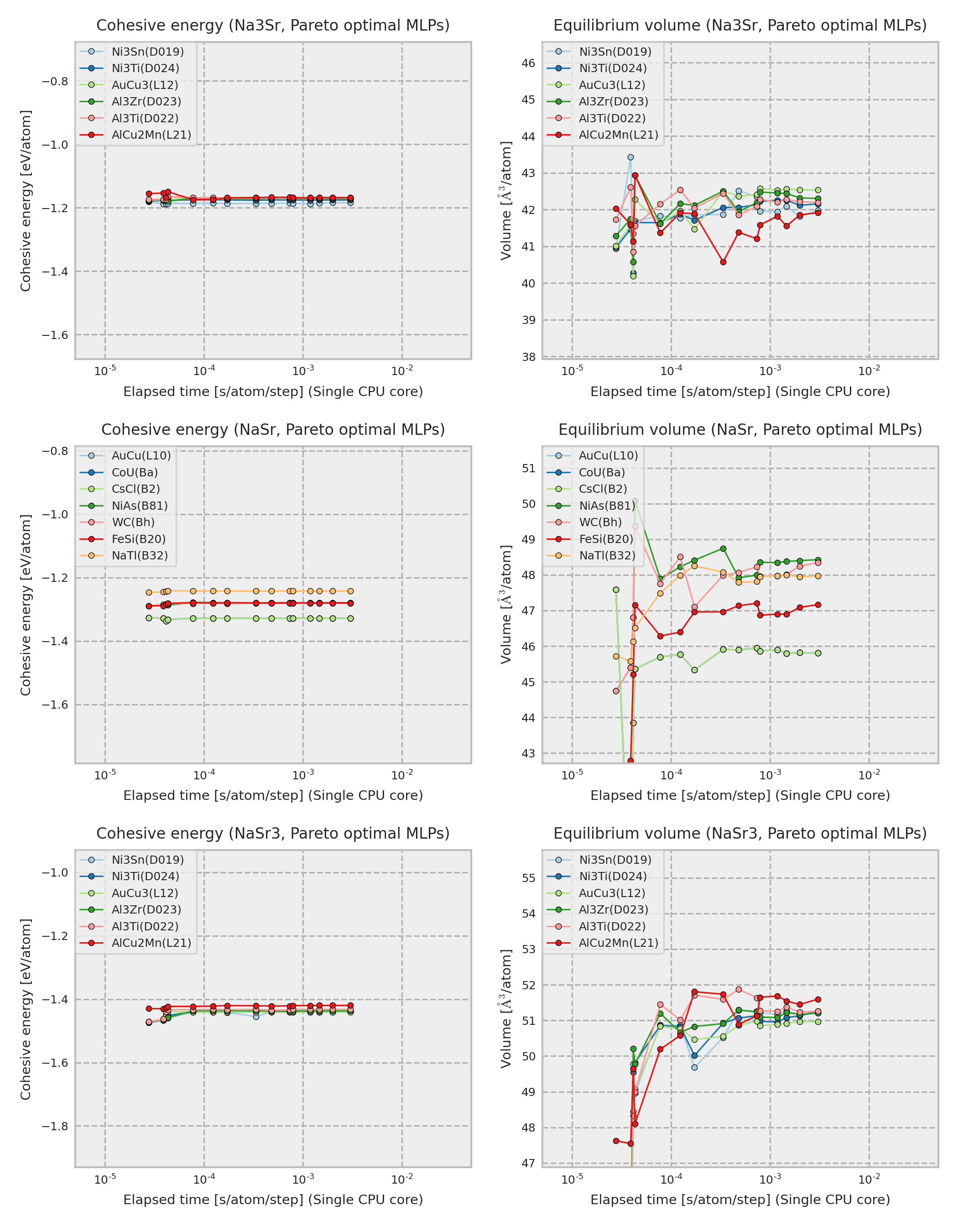 The cohesive energy and volume are obtained by performing a local structure optimization from the DFT equilibrium structure. In addition, the DFT equilibrium structure is obtained by optimizing a prototype structure included in ICSD, and the prototype is used as the structure legend in the figure. Therefore, the structure type of the converged structure is sometimes different from that shown in the legend even if the potential energy surface predicted by MLP is almost the same as the true one.