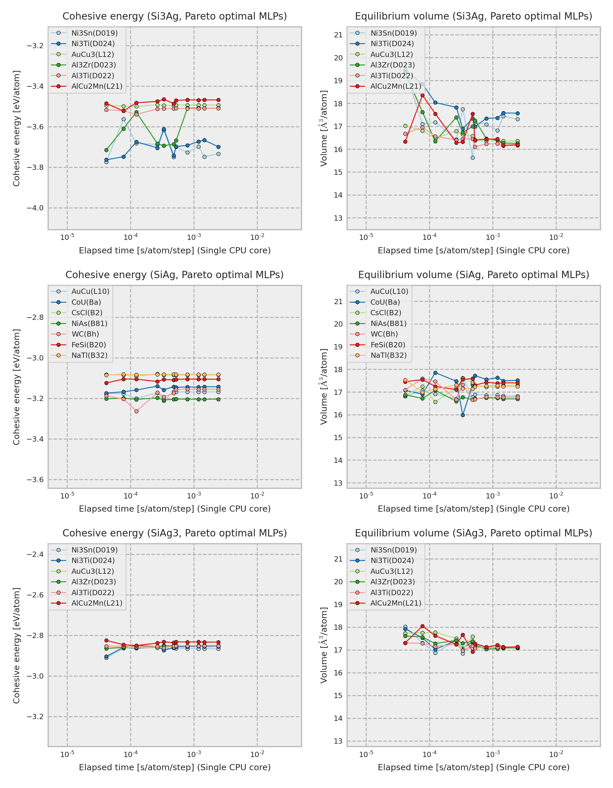 The cohesive energy and volume are obtained by performing a local structure optimization from the DFT equilibrium structure. In addition, the DFT equilibrium structure is obtained by optimizing a prototype structure included in ICSD, and the prototype is used as the structure legend in the figure. Therefore, the structure type of the converged structure is sometimes different from that shown in the legend even if the potential energy surface predicted by MLP is almost the same as the true one.