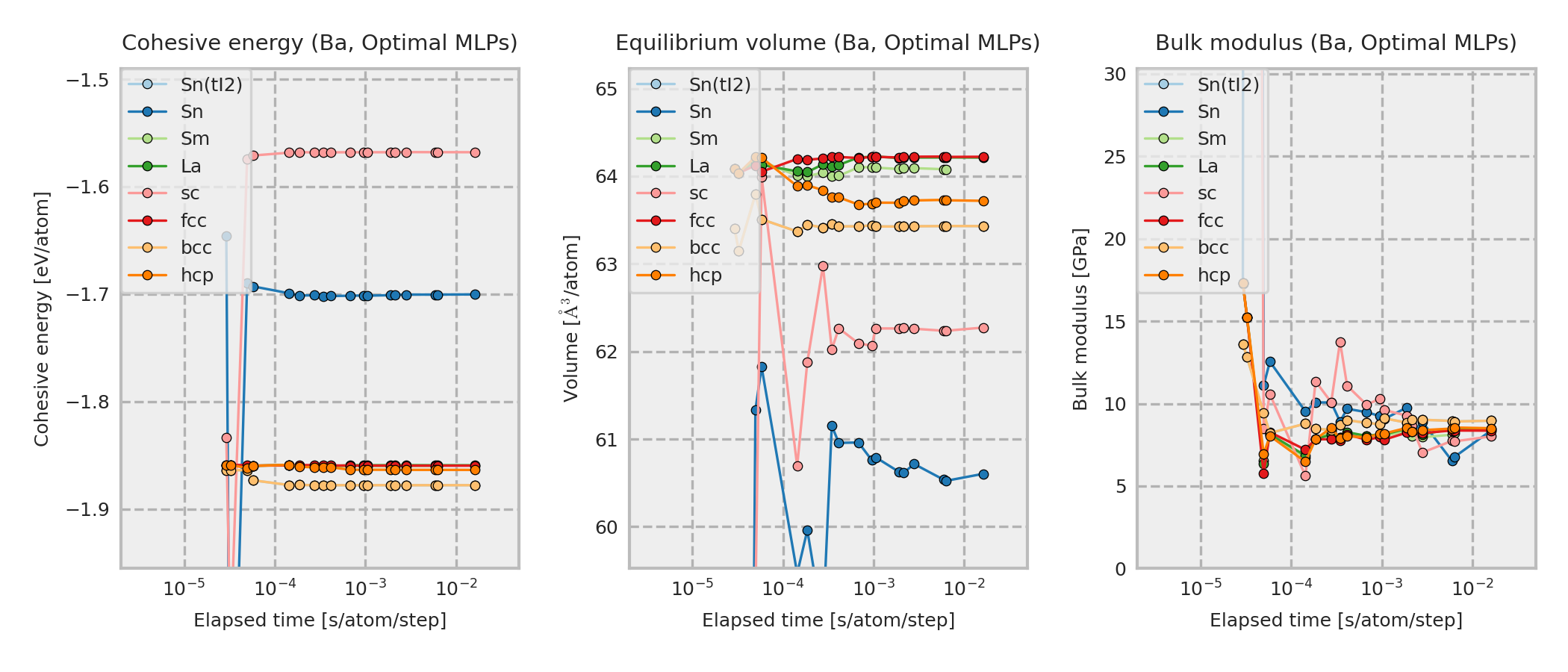 These properties are calculated for MLP equilibrium structures obtained by performing local structure optimizations from the DFT equilibrium structures. These DFT equilibrium structures are obtained by optimizing prototype structures that are included in ICSD. As a result, the structure type of the converged structure may sometimes differ from the one shown in the legend.
