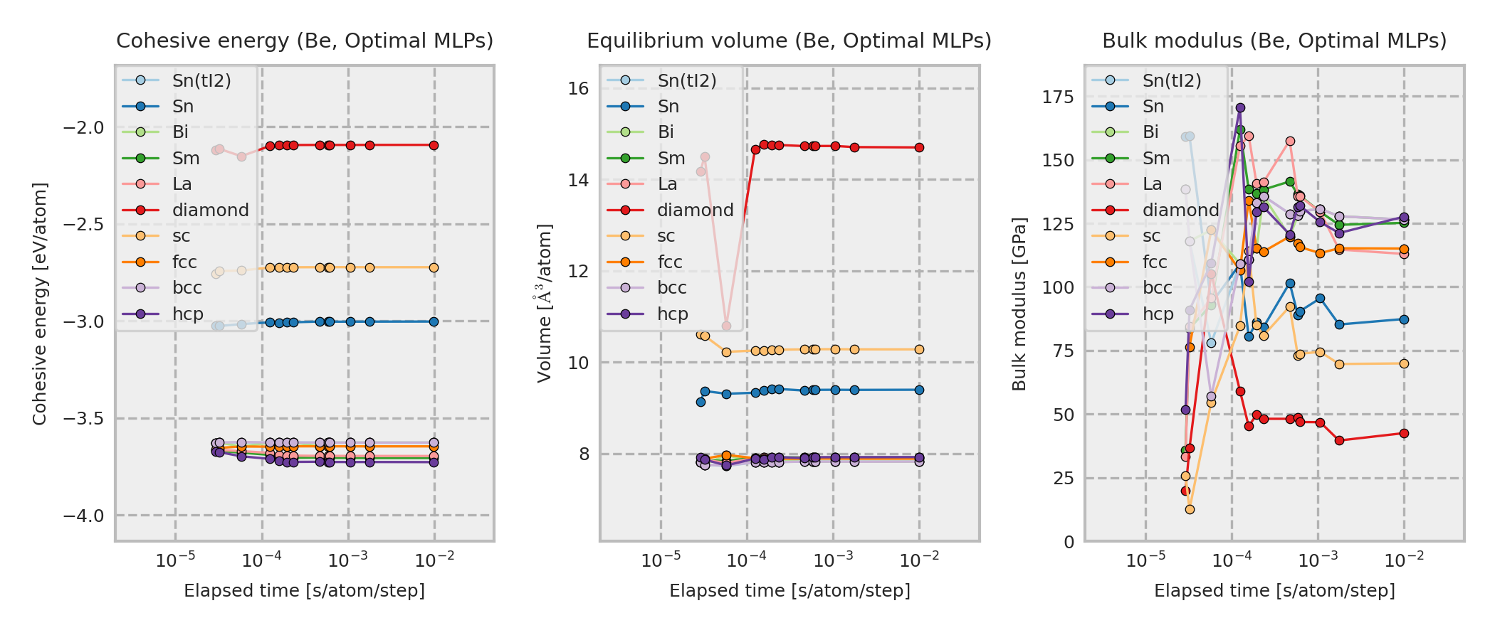 These properties are calculated for MLP equilibrium structures obtained by performing local structure optimizations from the DFT equilibrium structures. These DFT equilibrium structures are obtained by optimizing prototype structures that are included in ICSD. As a result, the structure type of the converged structure may sometimes differ from the one shown in the legend.