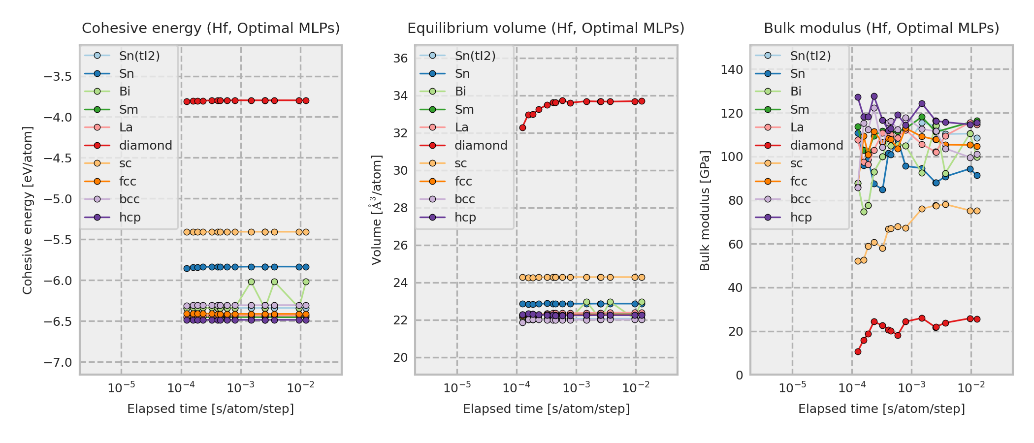 These properties are calculated for MLP equilibrium structures obtained by performing local structure optimizations from the DFT equilibrium structures. These DFT equilibrium structures are obtained by optimizing prototype structures that are included in ICSD. As a result, the structure type of the converged structure may sometimes differ from the one shown in the legend.