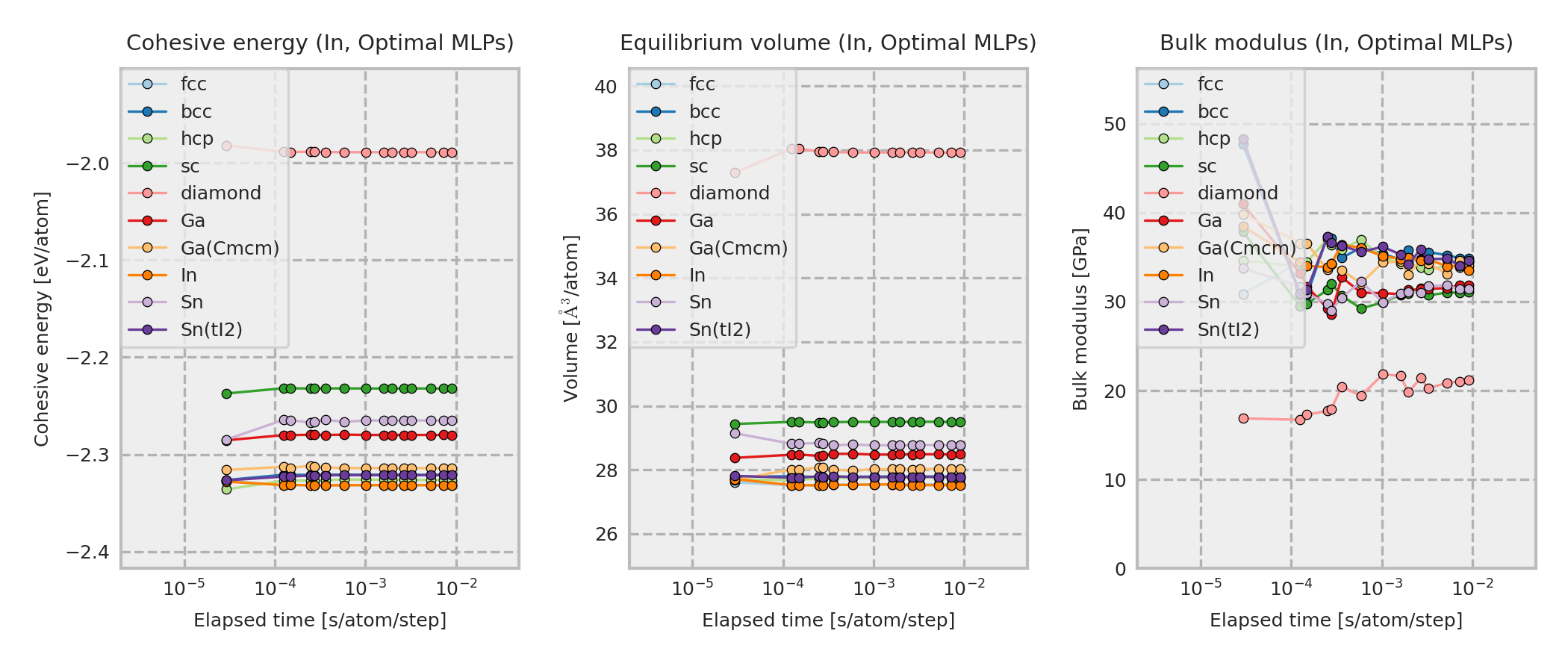 These properties are calculated for MLP equilibrium structures obtained by performing local structure optimizations from the DFT equilibrium structures. These DFT equilibrium structures are obtained by optimizing prototype structures that are included in ICSD. As a result, the structure type of the converged structure may sometimes differ from the one shown in the legend.
