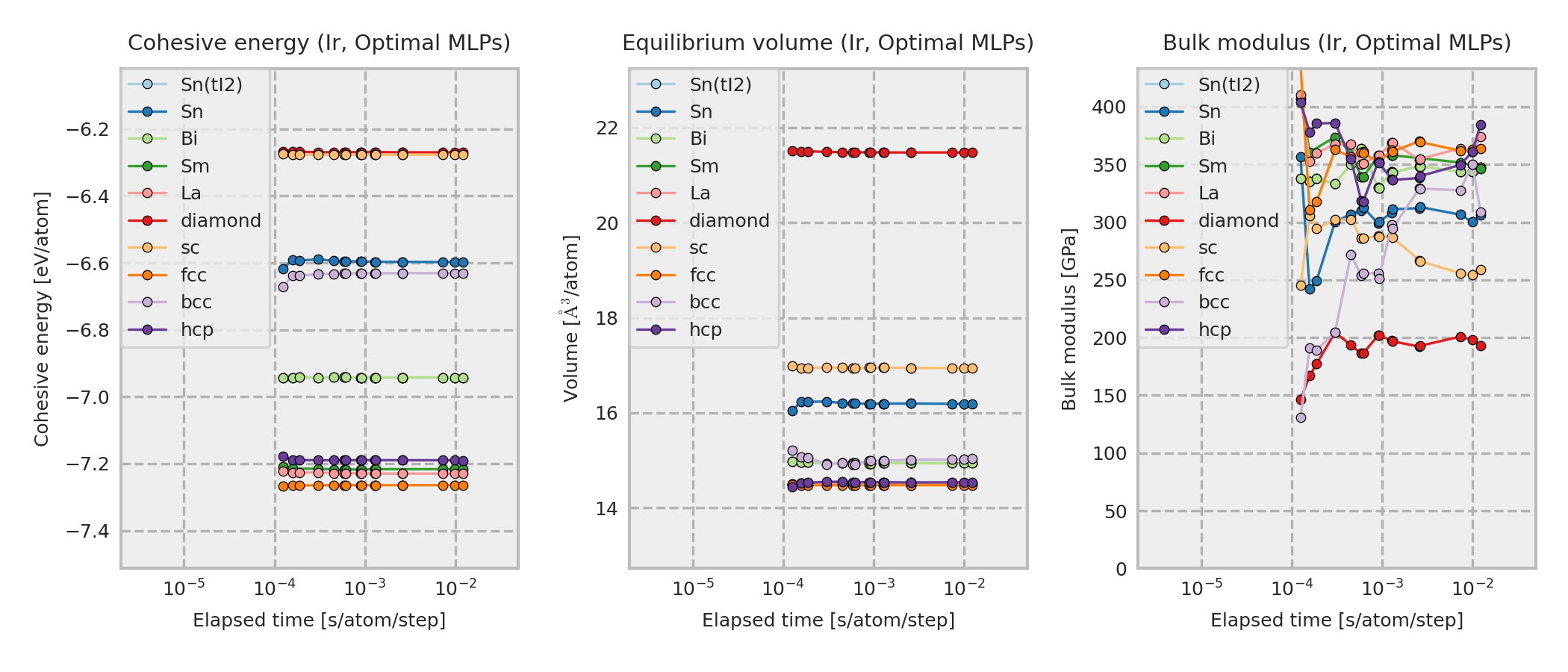 These properties are calculated for MLP equilibrium structures obtained by performing local structure optimizations from the DFT equilibrium structures. These DFT equilibrium structures are obtained by optimizing prototype structures that are included in ICSD. As a result, the structure type of the converged structure may sometimes differ from the one shown in the legend.