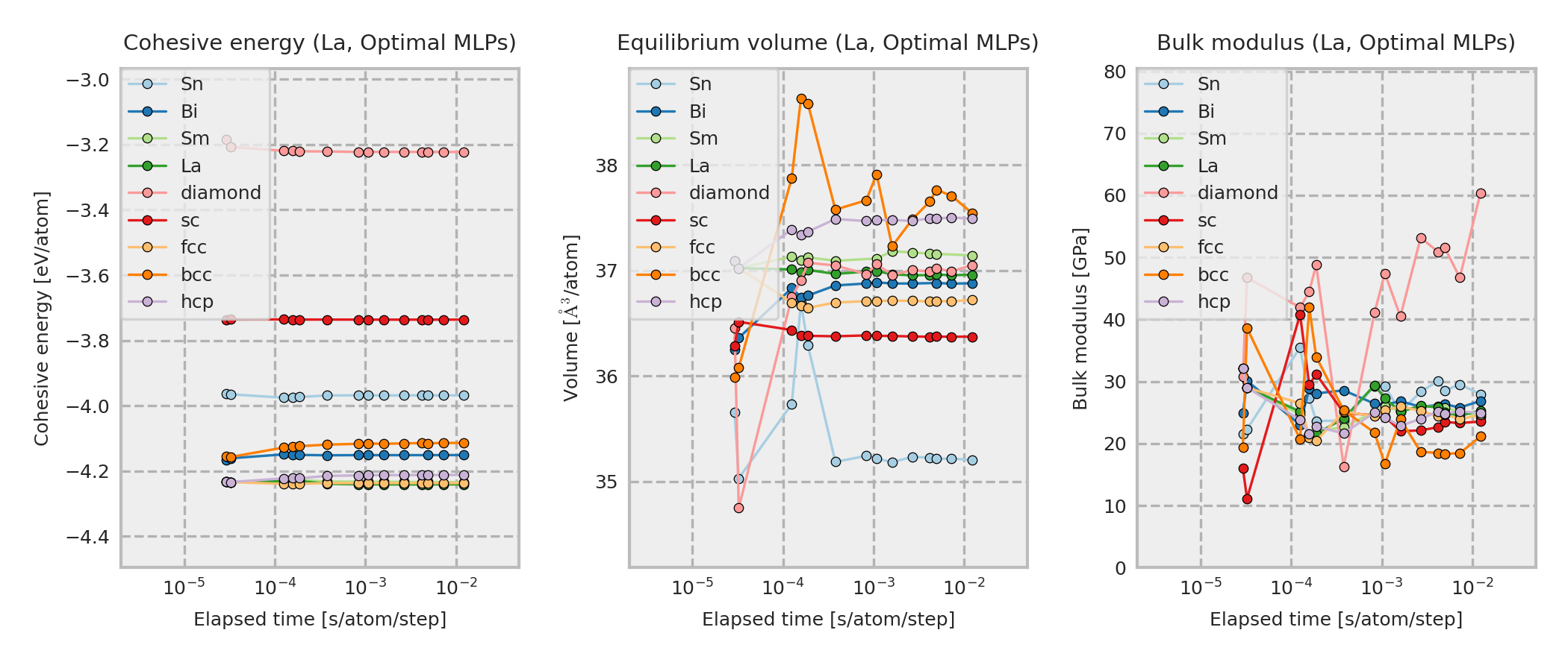 These properties are calculated for MLP equilibrium structures obtained by performing local structure optimizations from the DFT equilibrium structures. These DFT equilibrium structures are obtained by optimizing prototype structures that are included in ICSD. As a result, the structure type of the converged structure may sometimes differ from the one shown in the legend.
