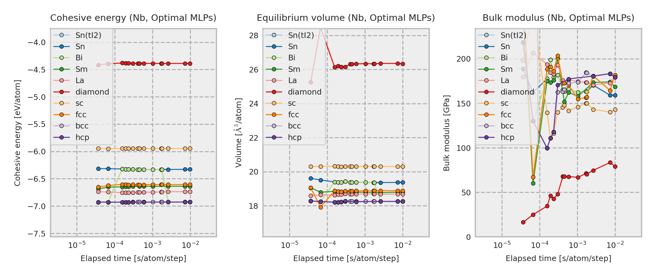 These properties are calculated for MLP equilibrium structures obtained by performing local structure optimizations from the DFT equilibrium structures. These DFT equilibrium structures are obtained by optimizing prototype structures that are included in ICSD. As a result, the structure type of the converged structure may sometimes differ from the one shown in the legend.