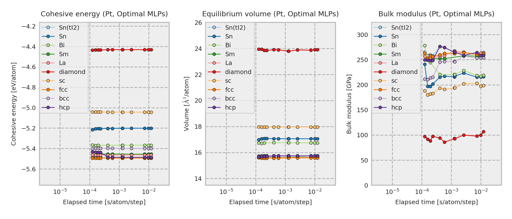 These properties are calculated for MLP equilibrium structures obtained by performing local structure optimizations from the DFT equilibrium structures. These DFT equilibrium structures are obtained by optimizing prototype structures that are included in ICSD. As a result, the structure type of the converged structure may sometimes differ from the one shown in the legend.