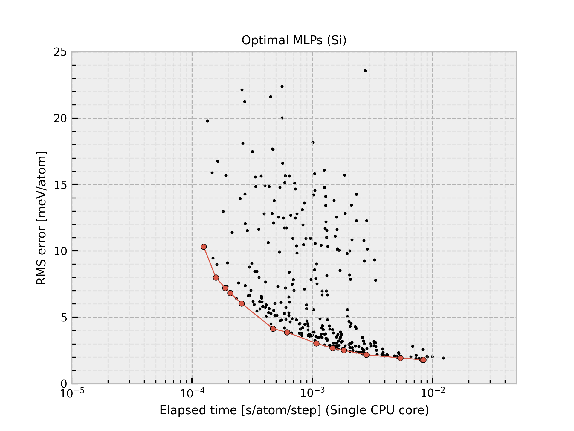 Column “Time” shows the time required to compute the energy and forces for 1 MD step and 1 atom, which is estimated from 10 runs for a large structure using a workstation with Intel(R) Xeon(R) CPU E5-2695 v4 @ 2.10GHz. Note that these MLPs should be carefully used for extreme structures. The MLPs often return meaningless values for them.