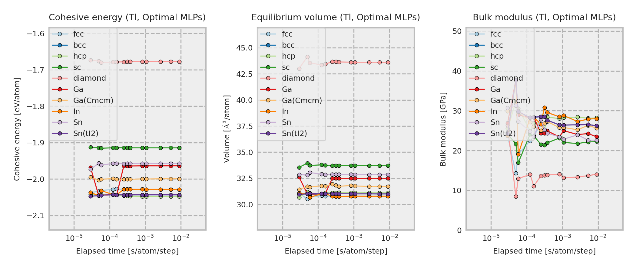 These properties are calculated for MLP equilibrium structures obtained by performing local structure optimizations from the DFT equilibrium structures. These DFT equilibrium structures are obtained by optimizing prototype structures that are included in ICSD. As a result, the structure type of the converged structure may sometimes differ from the one shown in the legend.