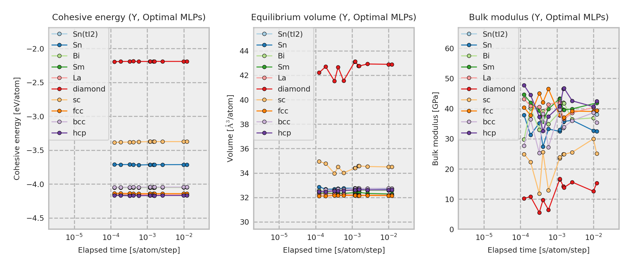 These properties are calculated for MLP equilibrium structures obtained by performing local structure optimizations from the DFT equilibrium structures. These DFT equilibrium structures are obtained by optimizing prototype structures that are included in ICSD. As a result, the structure type of the converged structure may sometimes differ from the one shown in the legend.